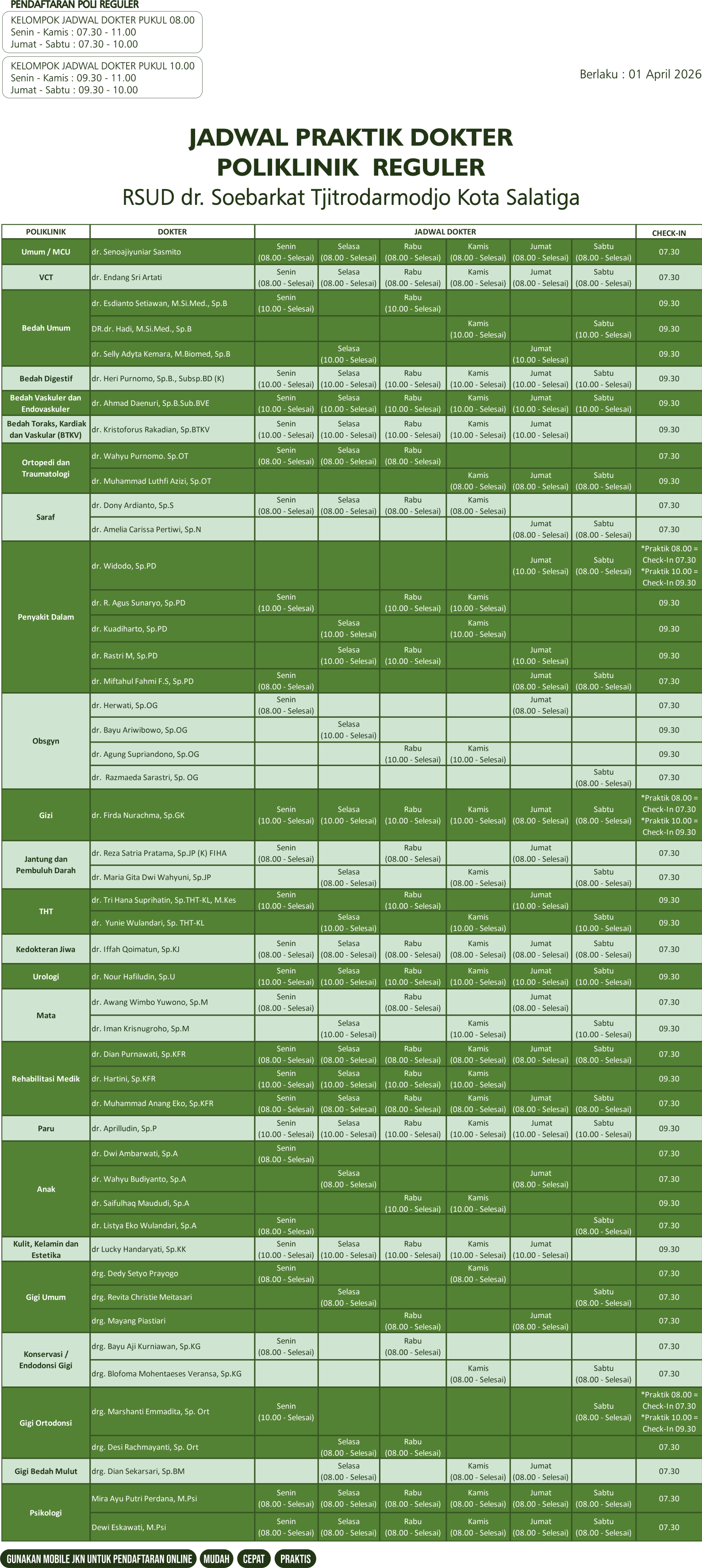 Hai Sobat RSUD, berikut kami informasikan jadwal praktik Dokter di Poliklinik RSUD dr. Soebarkat Tjitrodarmodjo Kota Salatiga